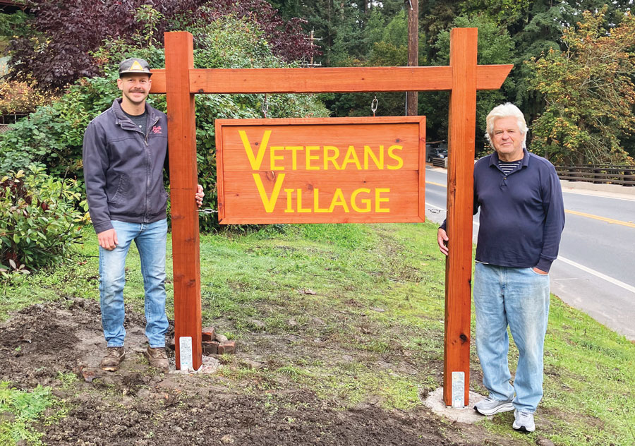 Humble Sea co-founder Nick Pavlina (left) and Rick Moran, the former commander of the 5888 VFW post, worked together to establish a more permanent sign for the Veterans Village along Highway 9 in Ben Lomond. (Chris Moran)